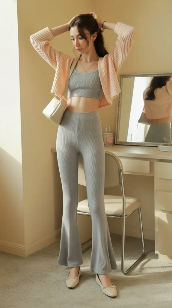 Playful, soft, and super cute. Grey flare leggings paired with a pastel cropped cardigan, ballet flats, and a mini shoulder bag = total cute outfit vibes. This is perfect for spring brunches, casual dates, or strolling through a bookstore pretending you’re in a rom-com. Grey adds a nice break from classic black, and the cardigan gives it that sweet, feminine twist. Honestly, it’s one of those everyday outfits that makes you smile when you see yourself in the mirror.