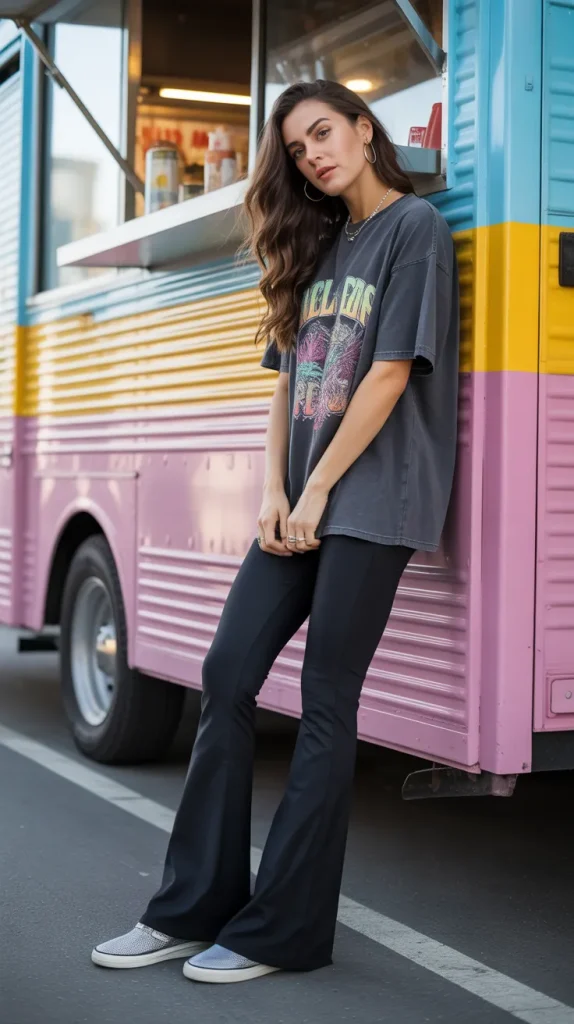 Nothing beats the relaxed combo of flare leggings and an oversized graphic tee. Slip-on sneakers and hoop earrings keep it playful and wearable. This one’s all about chill vibes think concerts, park hangouts, or casual weekend errands. It’s simple but has that cool-girl edge thanks to the graphic tee. Want effortless street style? This is it.