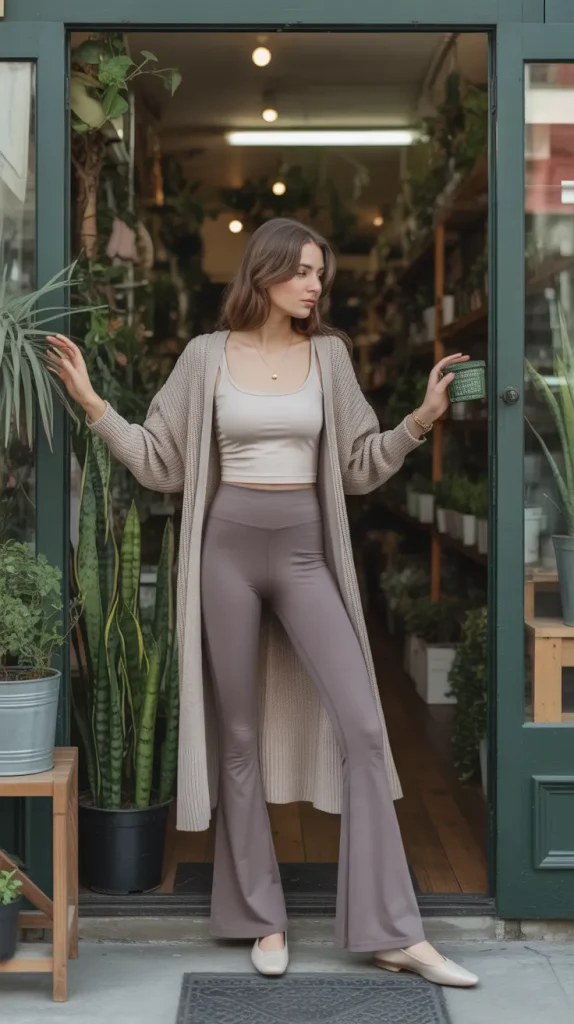 For an outfit that feels like a hug but looks polished, pair your flare leggings with a neutral tank and a beige longline cardigan. Ballet flats and a mini bag finish the look with soft sophistication. It’s the ultimate everyday outfit that transitions seamlessly from home to the outside world. Cozy yet chic this is comfort-core at its best.