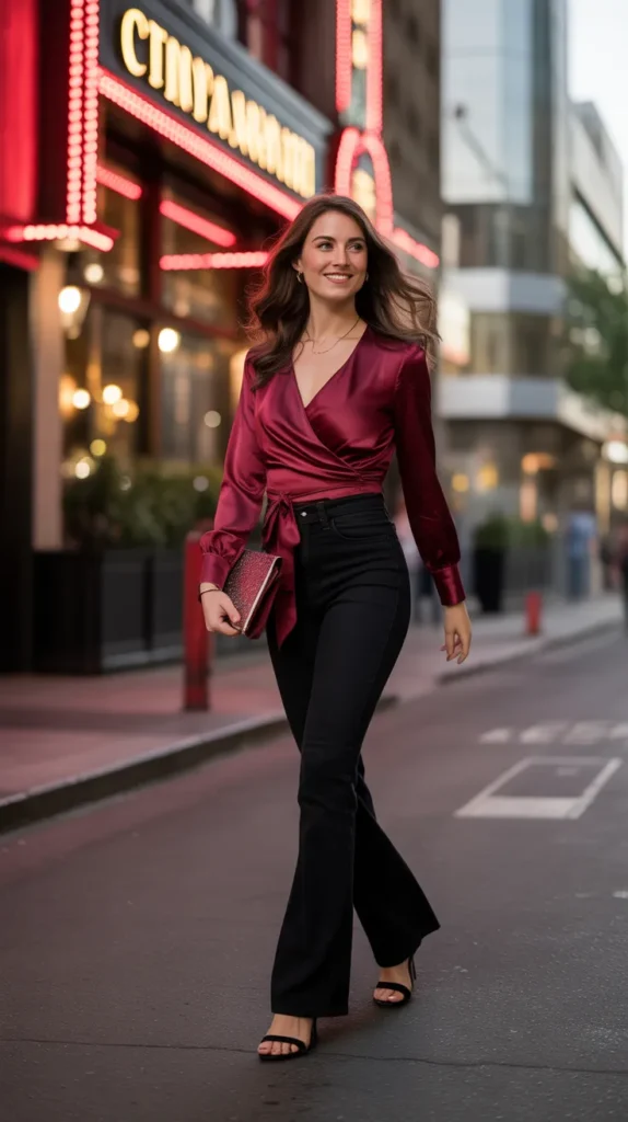 12. Black Flare Pants with a Deep Red Satin Wrap Top