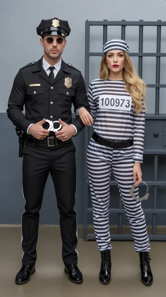 This costume is equal parts funny and spicy. π One partner steps into a hot cop uniform, complete with hat and handcuffs. The other rocks striped inmate gear, keeping the playful rivalry alive. Itβs hilarious because of the role reversal energy but also adorable when done as a couple. Add props like a toy baton or a βWantedβ sign to make it even better. This one always turns heads at Halloween parties because it mixes humor with bold vibes. Itβs proof that funny couple Halloween costumes donβt have to be all goofy they can be cheeky too.