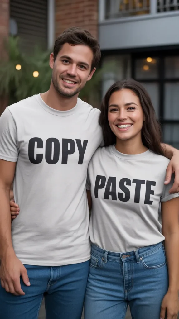 Sometimes the simplest ideas are the funniest. β¨οΈ Both partners wear white T-shirts, one with βCopyβ and the other with βPaste.β Itβs low-effort, high-impact, and guaranteed to get laughs. People will immediately get the joke, making it one of the easiest duo Halloween costumes ever. Add black jeans and sneakers to keep it simple, or go extra with matching wigs. This costume shows that you donβt need big props or expensive outfits to be the hit of the party. Itβs clever, modern, and undeniably funny.