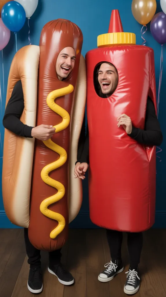 Food costumes always get laughs, and this combo is a classic. π One partner rocks a hotdog suit, while the other squeezes into a ketchup bottle outfit. Together, itβs a perfect recipe for a funny night out. The silliness of walking around as a condiment and snack makes this one of the most popular funny couple Halloween costumes. Itβs easy, recognizable, and great for photos. Add mustard or fries friends if you want to make it a group costume. Either way, this duo is a guaranteed crowd-pleaser.