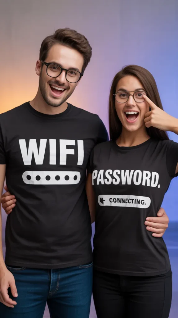 This tech-inspired idea is clever, funny, and very relatable. πΆ One partner wears a shirt labeled βWiFi,β while the other wears one that says βPassword.β The humor comes from the connection (pun intended), and everyone at the party will get it. You can even keep the password a secret for extra laughs. Itβs a costume that feels modern, low-maintenance, and witty. Pair with jeans and sneakers to keep it casual. Itβs one of those couple Halloween costumes that works great if youβre running out of time but still want to stand out.