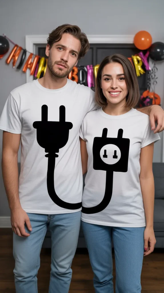 This cheeky costume never fails to get giggles. π One partner dresses as a plug, while the other completes the look as the socket. Itβs a little suggestive, a lot funny, and definitely a conversation starter. The boldness of the idea makes it memorable, but the execution can be as simple or elaborate as you like. Itβs a playful choice for couples who donβt mind being the center of attention. It checks all the boxes of funny couple Halloween costumes while still being a unique duo.