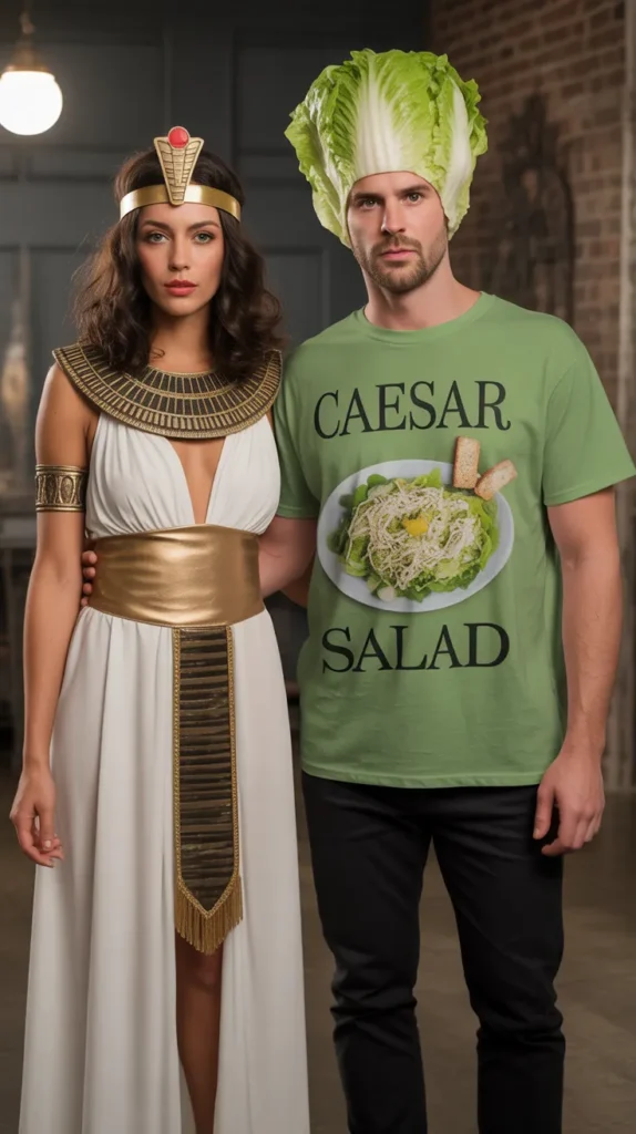 This clever mix of history and humor always gets a laugh. π₯ One partner steps out as regal Cleopatra in her iconic gold and jewel-toned attire. The other takes a punny route with a lettuce-green Caesar salad look yes, literally a salad! Together, this pairing nails the witty side of duo Halloween costumes while still being photogenic. Cleopatra brings chic glamour, while the salad adds the punchline. Itβs also a great conversation starter, because who expects to see a walking salad at a Halloween party? Add a prop like a golden scepter for Cleopatra and a fork or crouton accessory for the salad. Itβs one of those couple Halloween costumes thatβs just as funny as it is memorable.