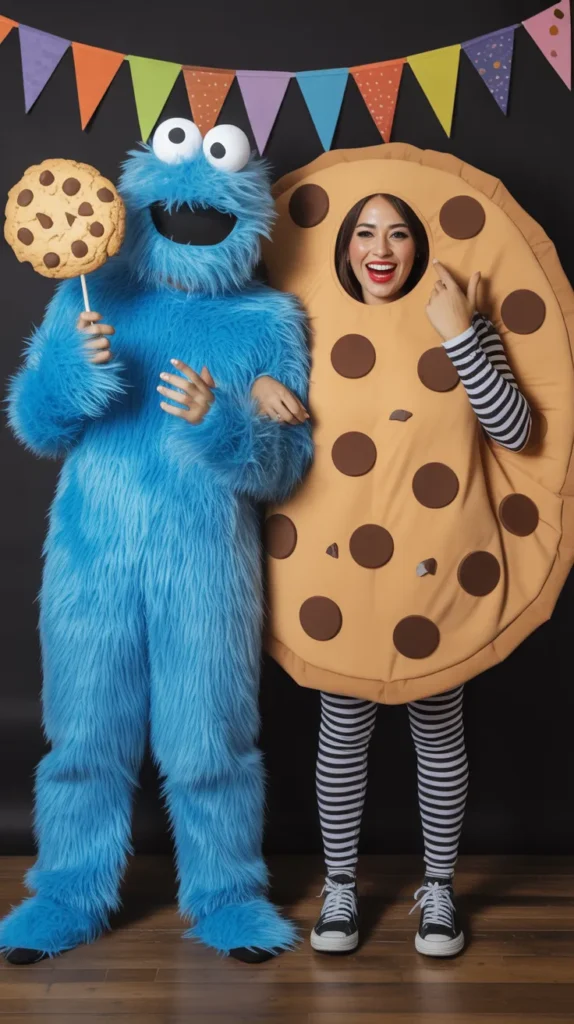 Sometimes the sweetest Halloween costumes are the ones that donβt take themselves too seriously. πͺ One partner gets fuzzy and fun as Cookie Monster, while the other steps out as a giant cookie. Itβs silly, instantly recognizable, and guaranteed to make people smile. Plus, itβs a great excuse for lots of βme want cookieβ jokes throughout the night. The blue fuzz paired with the chocolate-chip outfit brings a playful energy thatβs perfect for couples who love being lighthearted. Add a glass of milk prop if you want to take the pun further. This costume set is proof that funny can also be downright adorable.
