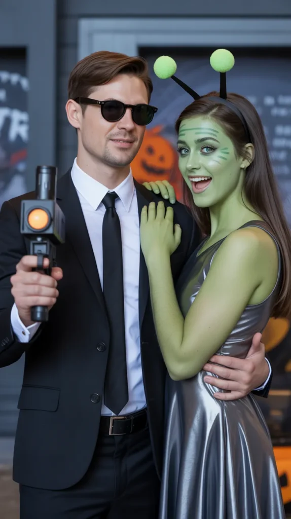 For sci-fi fans, this pairing is perfect. π½ One partner suits up as a sleek Men in Black agent, sunglasses and all. The other becomes a quirky alien girl, complete with sparkly makeup, antenna headband, or even green body paint. Together, itβs a clever mix of cool and comedic. It plays into classic pop culture while still delivering a unique twist on funny couple Halloween costumes. The contrast between serious secret agent and playful alien makes the pairing stand out at parties. You can even carry toy βneuralyzersβ or space props to lean into the theme. Itβs silly, but also stylish enough for those who want to look chic while getting laughs.