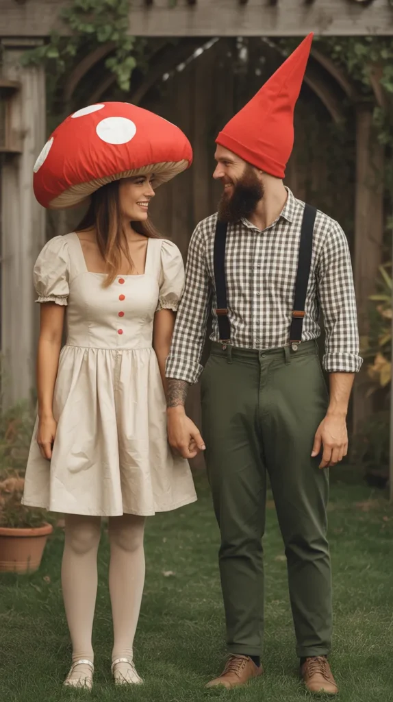 Straight out of a fairy tale garden, this pairing is whimsical and hilarious. π One partner goes as a quirky red-capped mushroom, while the other becomes a bearded gnome with suspenders and a hat. Itβs not only funny but also one of those cute costumes that looks charming in photos. The mix of earthy colors and playful props makes it stand out at any party. Plus, itβs super flexible you can go full costume-shop version or DIY with crafty touches. Itβs perfect for couples who want something silly yet sweet. Imagine entering a room as a gnome and mushroom duo instant smiles guaranteed.