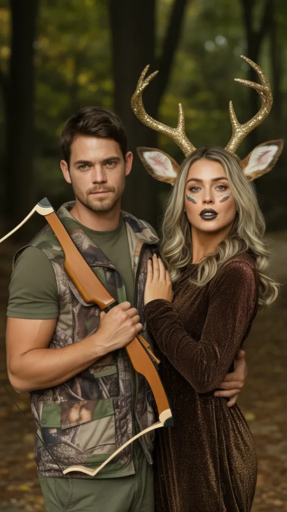 Bring the outdoors inside with this cheeky pairing. π¦ One partner dresses as a rugged hunter, complete with camo or flannel. The other becomes a sparkly deer darling, rocking antlers, glittery makeup, and maybe a tutu or brown dress. The mix of rugged and glam makes this one of the funniest duo Halloween costumes out there. Itβs a playful take on nature and adds a little sass to the night. Add props like a toy bow or binoculars for the hunter and sparkly face gems for the deer. Together, the look is funny, flirty, and totally memorable.