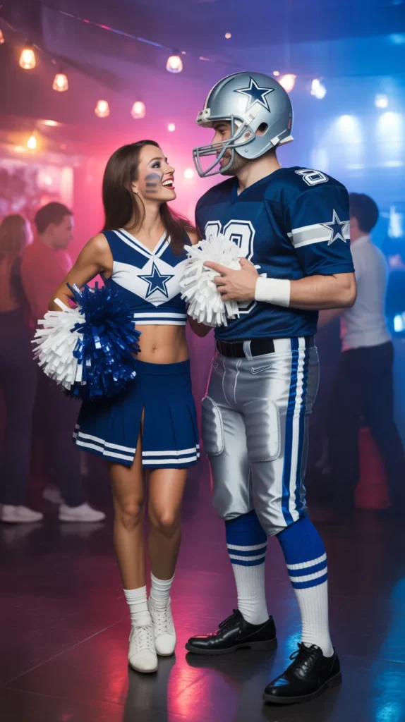 For sports-loving couples, this oneβs a no-brainer. π One goes all out as a cheerleader pom-poms, skirt, and high-energy vibes. The other rocks a football player uniform, pads optional. This combination is funny because it exaggerates the sports stereotype, but itβs also downright cute. Itβs one of those couple Halloween costumes thatβs comfortable and easy to move in, making it great for dancing at parties. Add playful chants or touchdown celebrations for extra laughs. The cheerleaderβs bubbly style paired with the playerβs βgame faceβ makes for a hilarious duo that everyone will recognize.