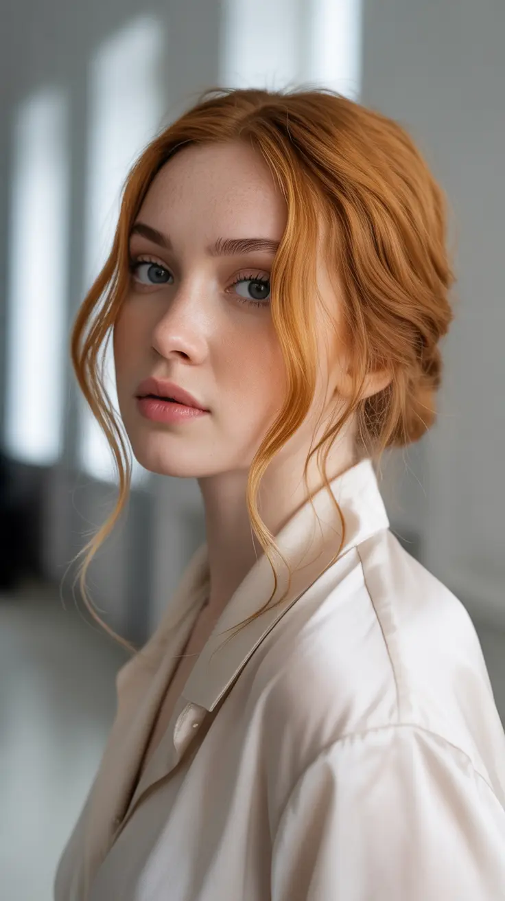 In the image, you can see a beautifully crafted messy bun that showcases the vibrant ginger streaks. The loose strands around the face create a soft, effortless vibe. This hairstyle not only highlights the unique shades of ginger hair but also allows for a playful and carefree look.