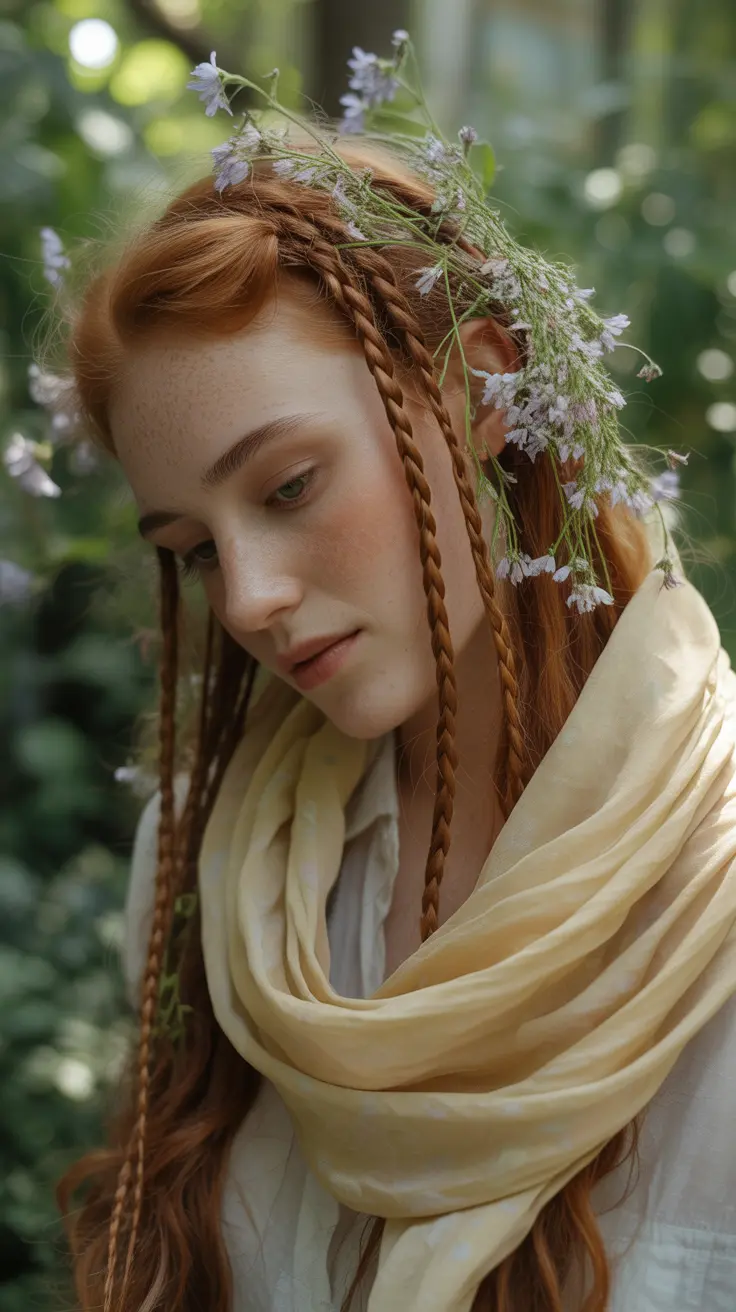 This particular style features two intricate braids adorned with delicate floral accents. These tiny flowers add a touch of whimsy and charm, making the hairstyle perfect for outdoor events or casual outings. The bright colors of the flowers complement the rich tones of the ginger hair, enhancing its radiance.