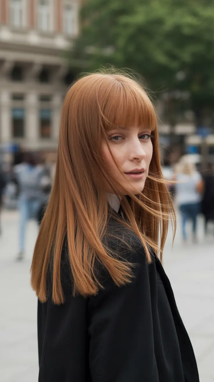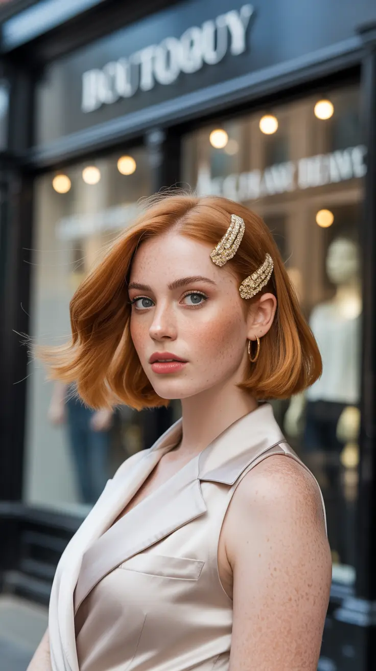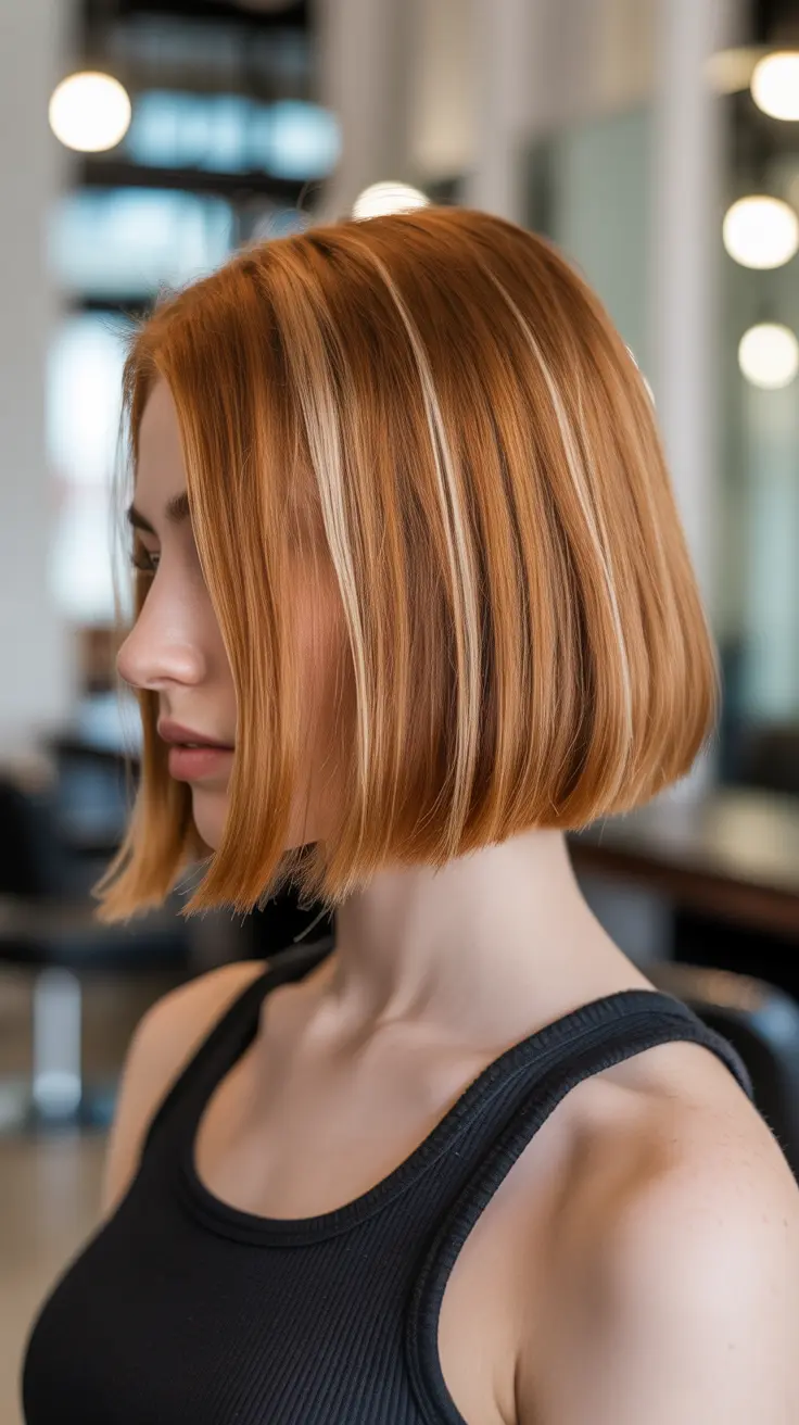 The blunt bob is a stylish choice that pairs beautifully with ginger hair. This look features a sharp cut that frames the face, giving it a modern edge. The ginger base color is warm and inviting, while the subtle blonde tips add a touch of brightness.