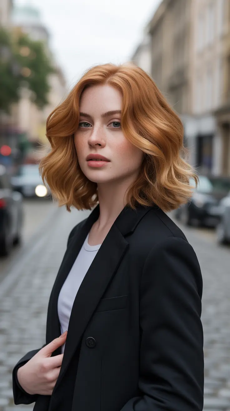 The combination of ginger and blonde is perfect for those looking to experiment with red hair color ideas. It offers a unique twist that stands out without being overwhelming. The soft waves of the lob enhance the overall look, giving it a playful yet sophisticated vibe.