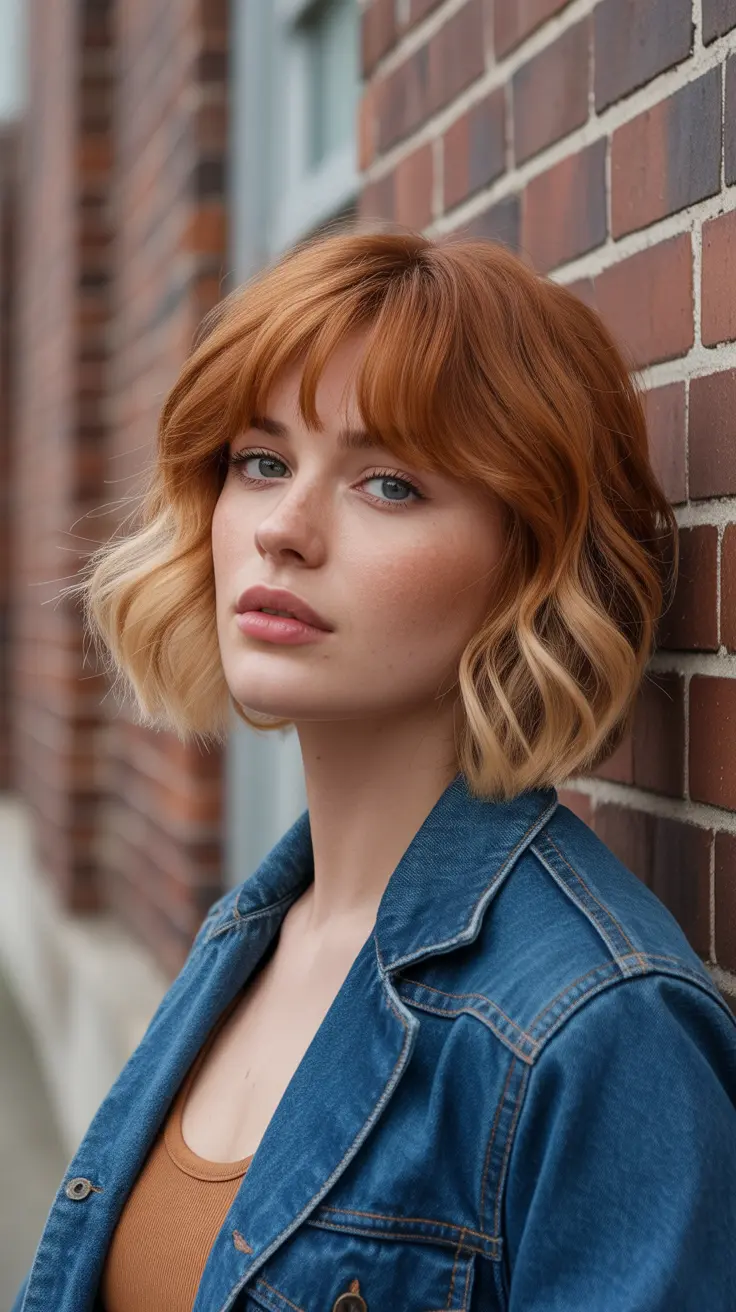 The bob cut is chic and modern, framing the face beautifully. The blonde fringe highlights bring out the richness of the ginger tones, adding depth and contrast. This style is not just about color; it’s about showcasing personality through hair.