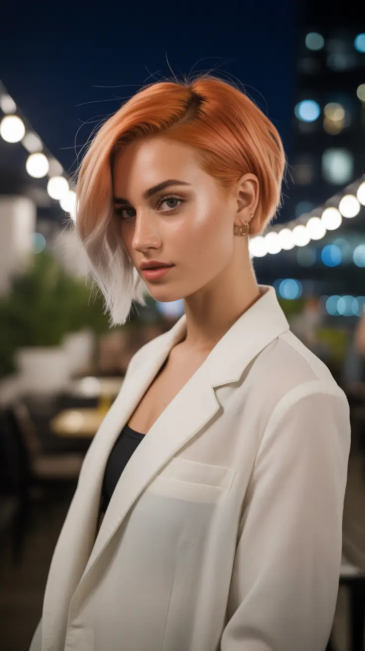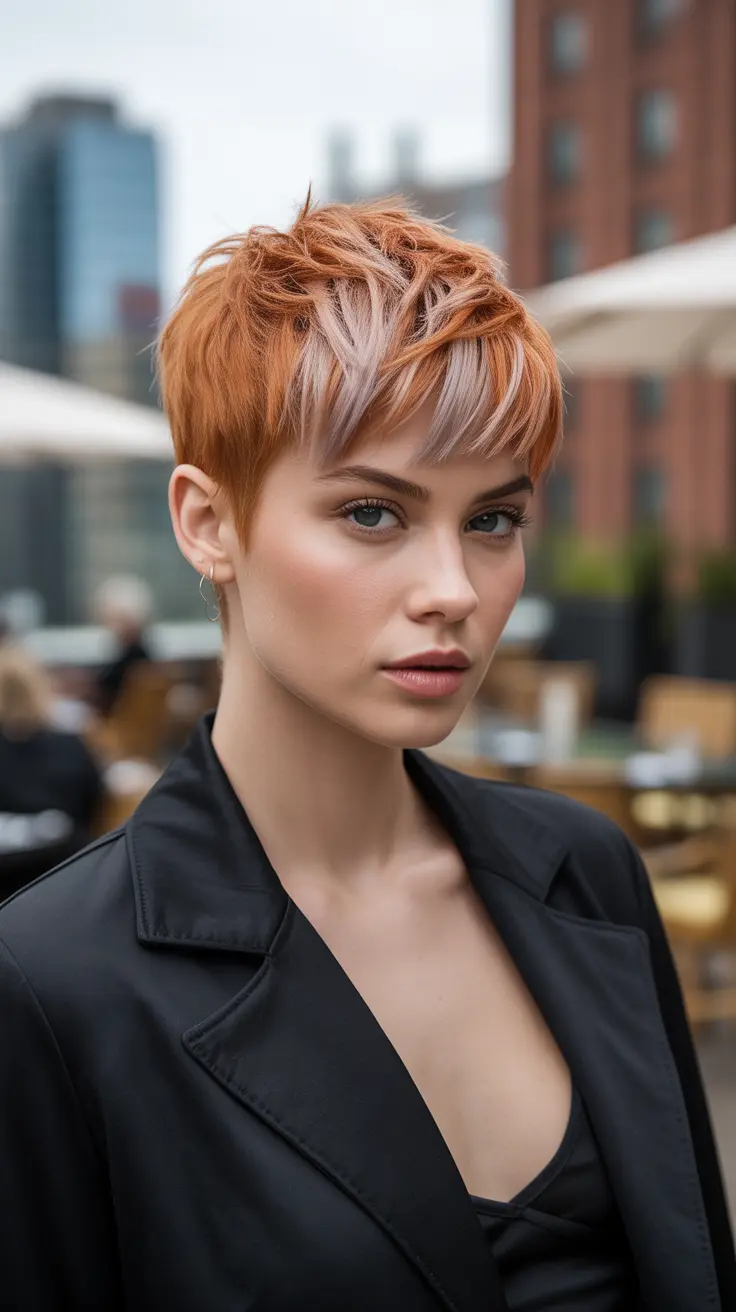 The ginger pixie bob with platinum blonde tips is a stunning hairstyle that combines warmth and brightness. This look features a short, chic cut that frames the face beautifully, making it a great choice for those who want a fresh and modern vibe.