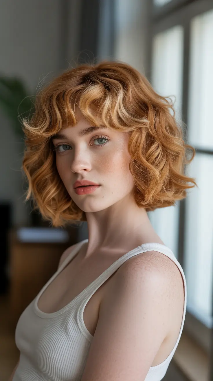 18. Soft Curly Bob In Ginger With Blonde Fringe Highlights