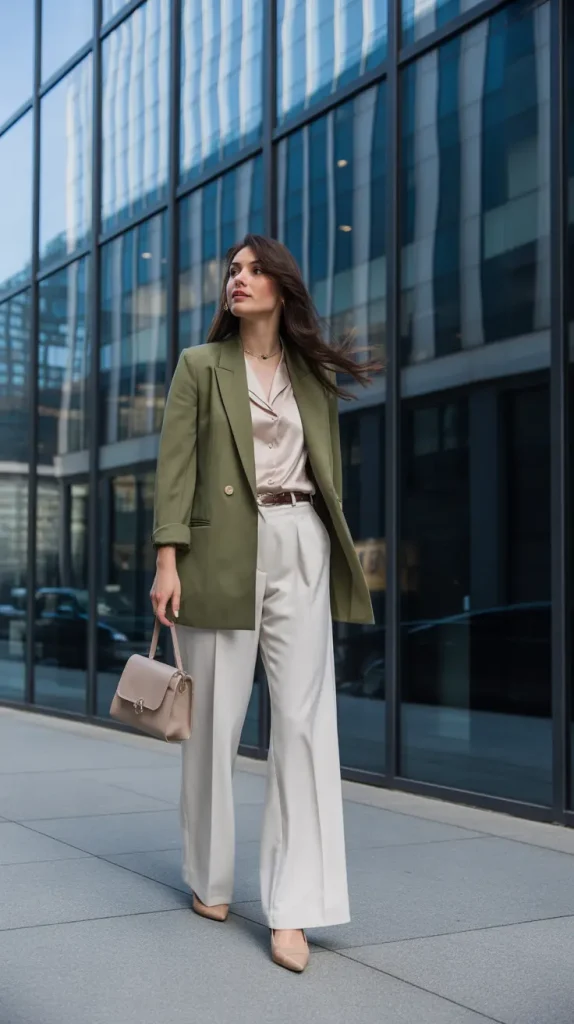 This is the definition of sleek and polished. A tailored olive blazer with wide-leg white trousers feels crisp, modern, and effortlessly professional. Add a silk blouse and nude pumps, and you’re basically ready to conquer the boardroom. What I love most is how the olive softens the whole look so it doesn’t feel intimidating. It’s one of those stylish work outfits that makes you look in charge without even trying. Ever notice how white trousers automatically give “luxury vibes”? Yeah, this outfit nails that.