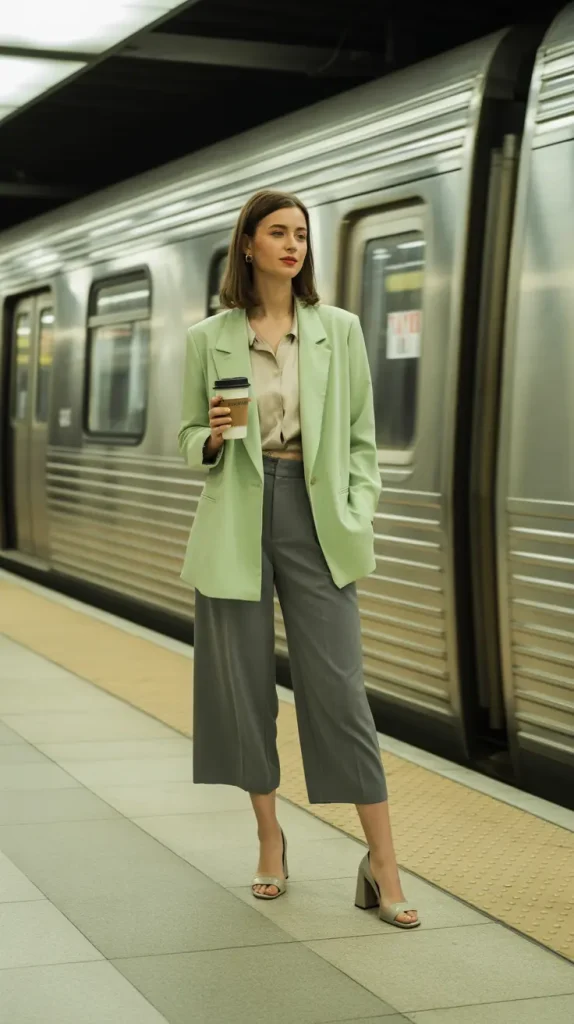 Culottes are one of those pieces that look like trousers but feel like sweatpants and I’m not mad about it. A light green blazer with cropped grey culottes and block heels creates a structured but comfy look. Add a tucked blouse and coffee-in-hand, and you’re basically morning-commute ready. This is one of those casual outfits for work that makes you feel put together before 9 a.m. Ever wish every outfit felt this balanced?