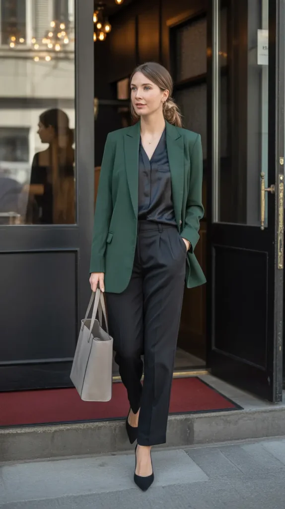 For instant drama (in the best way), go jewel-toned. An emerald blazer with ivory wide-leg trousers feels powerful but not overbearing. Pumps and a silk scarf add polish. It’s one of those professional outfits that makes a big impact without trying too hard. Jewel tones always feel rich, and this pairing is proof. Perfect for those days when you need a little extra confidence.