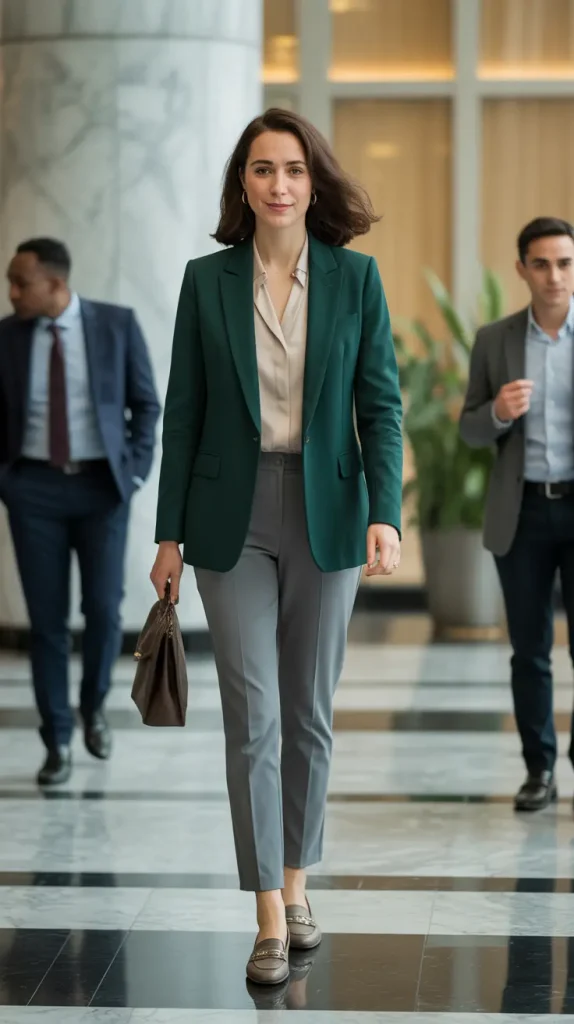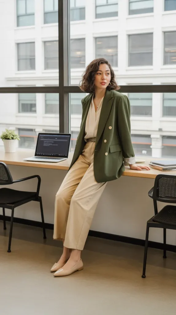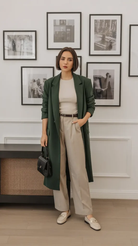 Neutrals always calm down bold shades, and that’s exactly why this works. A forest green blazer with beige trousers and a cream blouse feels sophisticated but approachable. Add loafers and you’ve got a polished stylish work outfit that works for almost any setting. Ever notice how green and beige together always feel expensive? This is that combo.