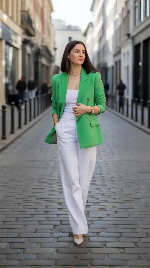 Here’s how to make an entrance. A bright green blazer styled over an all-white outfit instantly pops. Pumps and a metallic watch add polish without stealing attention. This is one of those green blazer outfits for women that commands confidence in the best way. Honestly, if you’ve got a bold meeting or an event, this is the look to choose.
