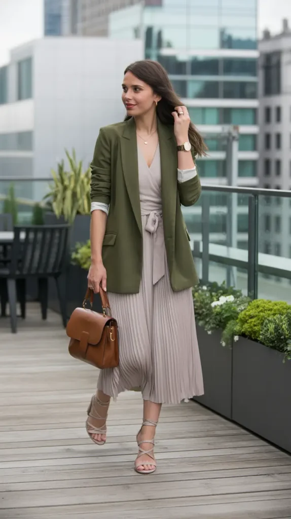 Wrap dresses are universally flattering, and adding an olive blazer makes them instantly professional. Add strappy heels and a satchel, and you’ve got a dinner-to-business outfit that just works. It’s sophisticated but relaxed at the same time. This is the perfect balance of structured and feminine. Ever want one outfit that handles everything on your calendar? This is it.