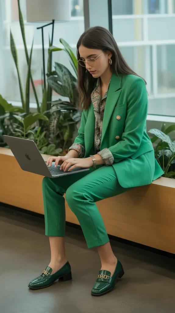 Prints bring personality, and emerald is bold enough to hold its own. Pair a printed silk blouse with slim trousers and an emerald blazer, and you’ve got a stylish work outfit that feels fun but professional. Loafers make it practical for long days. Honestly, this is the kind of outfit that makes office lounges feel like mini fashion shows. And why not? Looking good always boosts confidence.