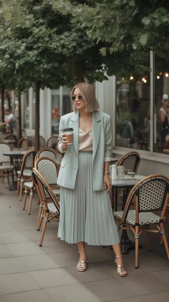 Here’s how to keep things soft but still sharp. A mint blazer with a flowy pleated skirt creates an outfit that’s playful yet totally work-appropriate. Add strappy sandals and a camisole, and suddenly you’ve got one of those casual outfits for work that still looks chic. Mint always brings a fresh energy, and the pleats add that movement we all secretly love. Ever had an outfit that makes you feel lighter just by wearing it? This is that.