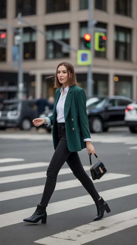 This look is sleek, modern, and ridiculously easy to pull together. A bottle green blazer with black skinny trousers and ankle boots gives off confident downtown vibes. Add a structured handbag and you’re good for both office hours and after-work events. It’s a no-fuss stylish work outfit that still feels powerful. Honestly, the darker green shade keeps it professional while the skinny pants make it feel sharp. It’s a win-win.