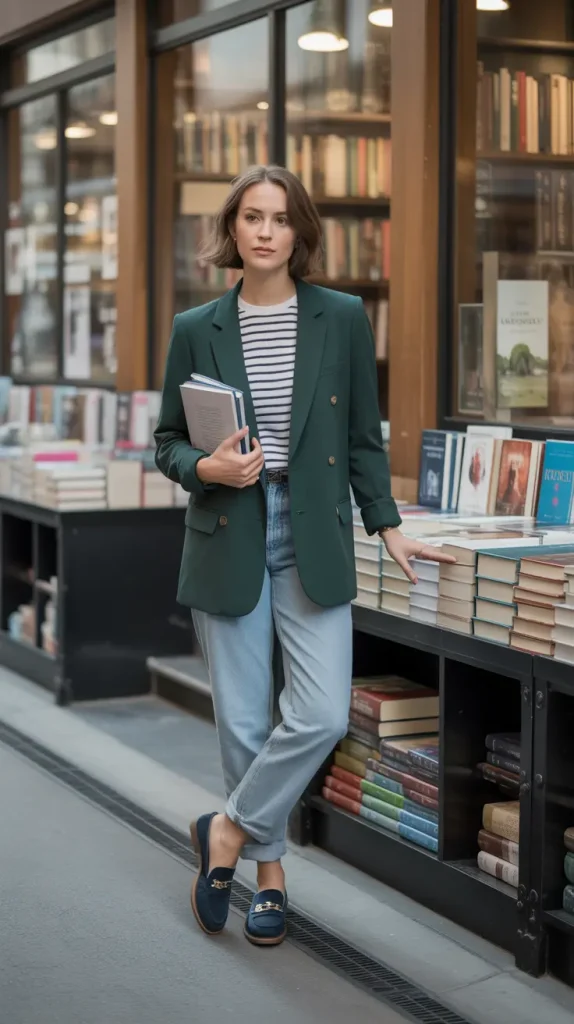 Stripes instantly make any outfit more fun. Layer a forest green blazer over a navy-and-white striped shirt and jeans, and suddenly you’re giving smart-casual perfection. Loafers keep it grounded but polished. This is one of those casual outfits for work that’s creative without looking sloppy. Plus, bookstores and coffee shops suddenly feel like mini runways in this look. Ever noticed how stripes make even the most basic outfits look styled? This proves it.