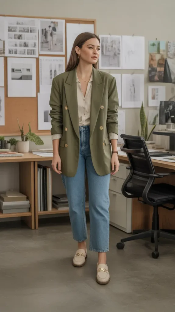 Denim and blazers are always a good idea. Pair an olive green blazer with straight-leg jeans, a tucked blouse, and loafers, and you’ve nailed the casual outfits for work vibe. It’s structured enough for a creative office but relaxed enough for off-duty. Honestly, olive and denim are such a power couple in fashion. Isn’t it funny how jeans + blazer combos always manage to save the day?