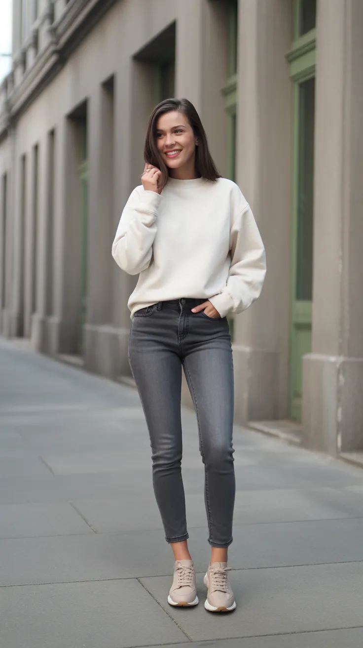 1. Grey Skinny Jeans With A White Crewneck Sweater
