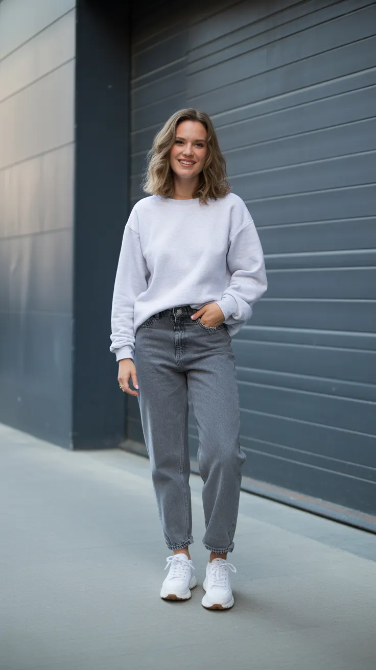 Grey boyfriend jeans paired with a relaxed sweatshirt create a comfy yet stylish look. This outfit is perfect for casual style outfits, making it easy to dress up or down. Add some white sneakers for a simple trendy outfit that’s great for uni or a day out.