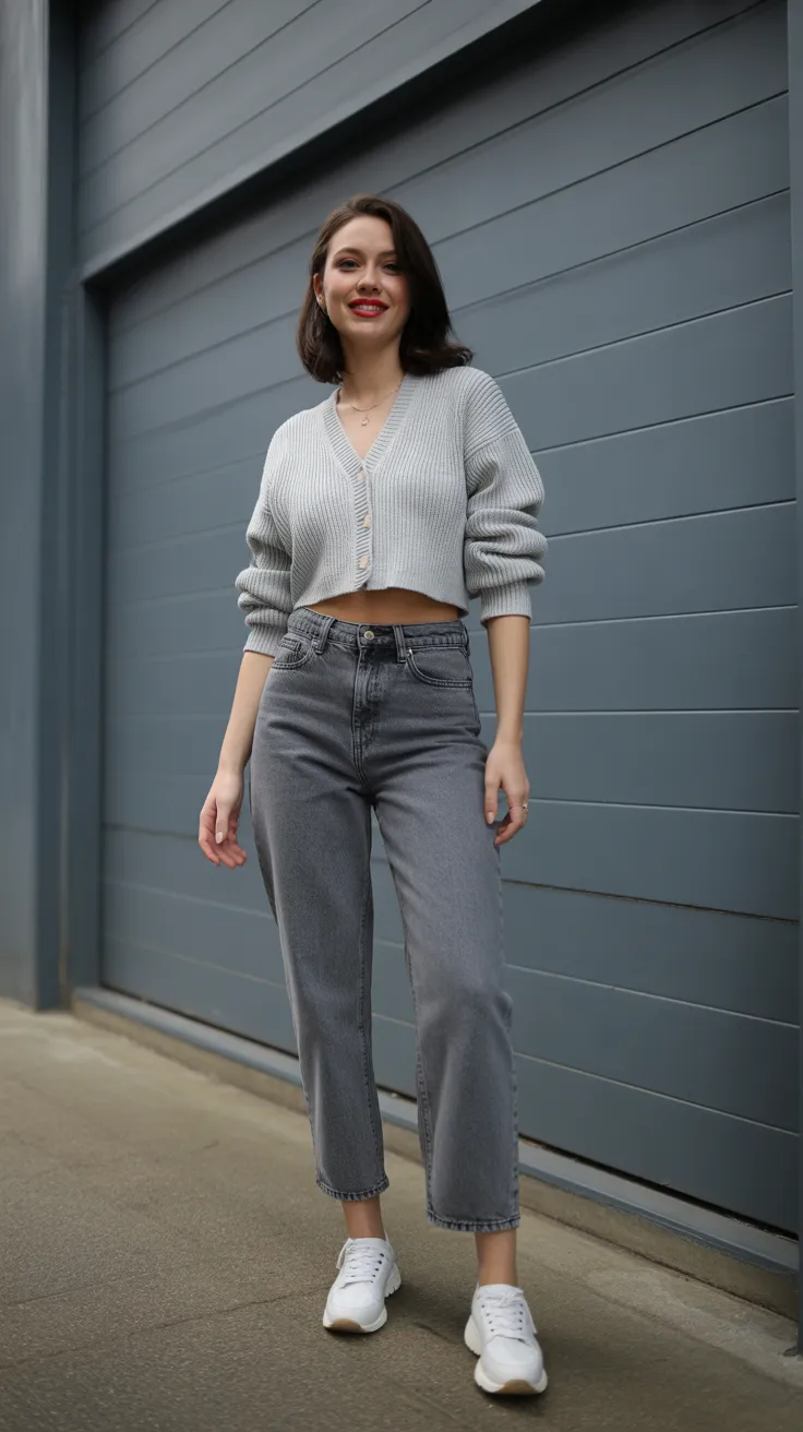 13. Grey High-Waisted Jeans With Cropped Cardigan