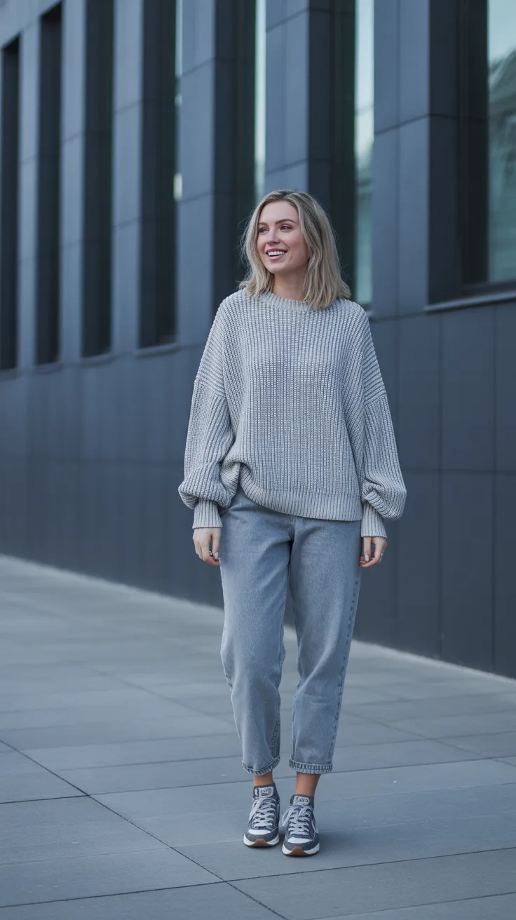 18. Light Gray Jeans With Oversized Knit And Sneakers