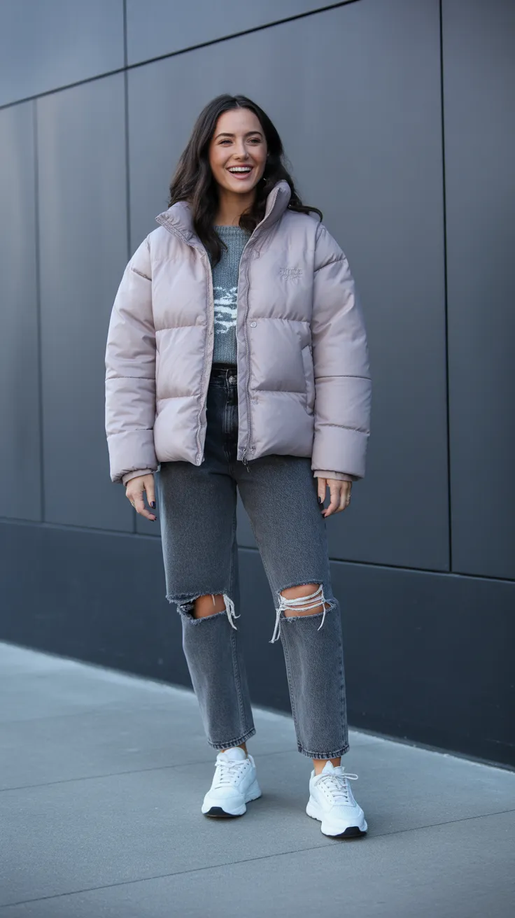 Grey distressed jeans paired with a cozy puffer jacket create a chic yet casual look. This outfit is perfect for uni outfits or simple trendy outfits that keep you warm and stylish. Add some ankle boots for a complete vibe that’s both comfortable and on-trend.
