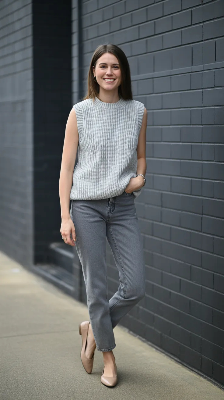 21. Grey Jeans With Sleeveless Knit Vest And Flats