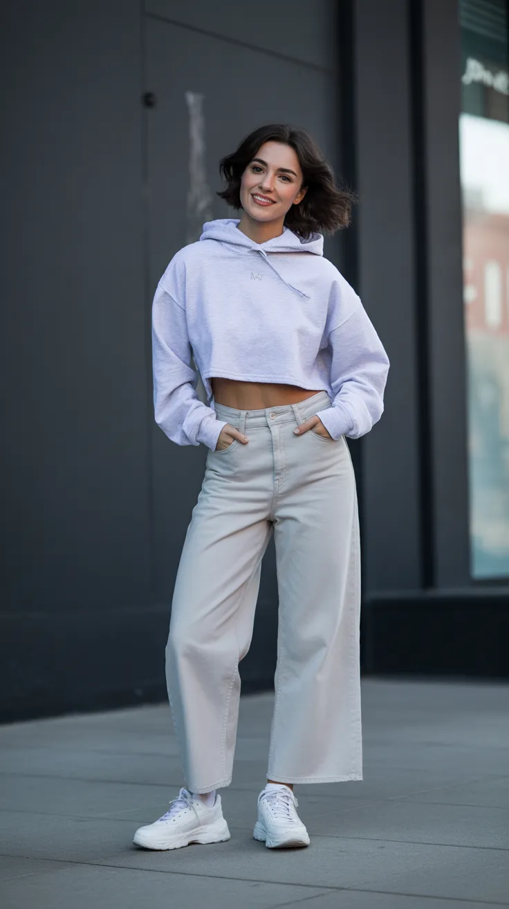 4. Light Gray Wide-Leg Jeans With Cropped Hoodie