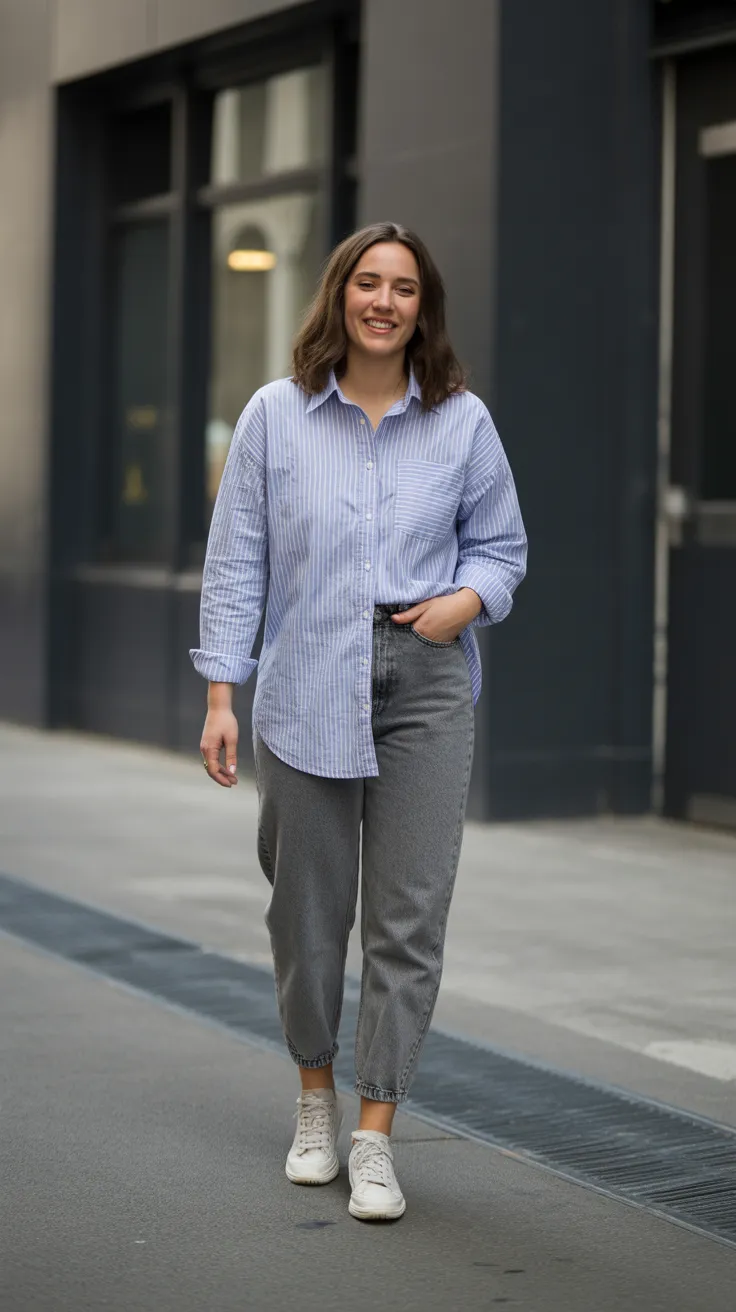 Grey mom jeans paired with a striped button-up shirt create a chic yet casual look. This simple trendy outfit is perfect for a day out or a relaxed gathering with friends. Add some loafers for a polished touch, and you’re ready to go!