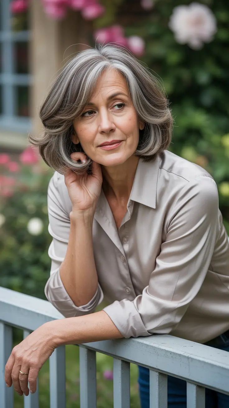 In the image, you can see a woman sporting this chic style. The flicked ends add movement, making the hair look lively and full. It’s a great way to embrace age-appropriate haircuts that are both stylish and easy to maintain.