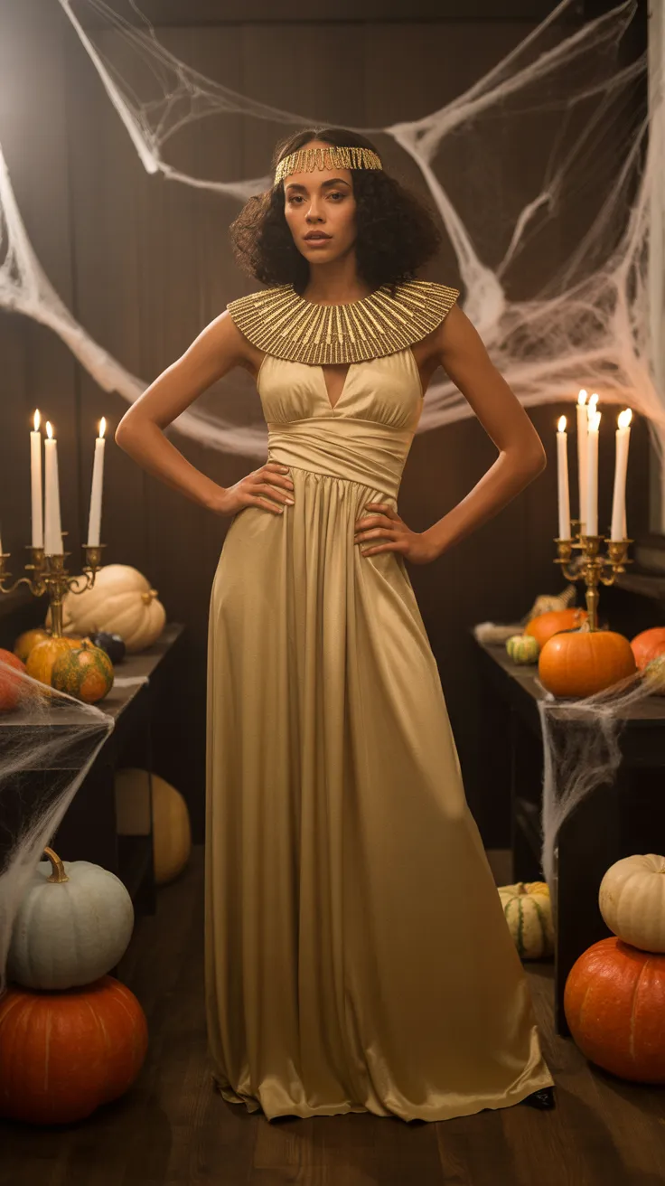 Channel your inner queen with a stunning Cleopatra-inspired gold dress. This look is not just about the outfit; the headpiece and bold jewelry add a touch of royalty. Perfect for Halloween, it’s a unique way to celebrate your beauty and strength.