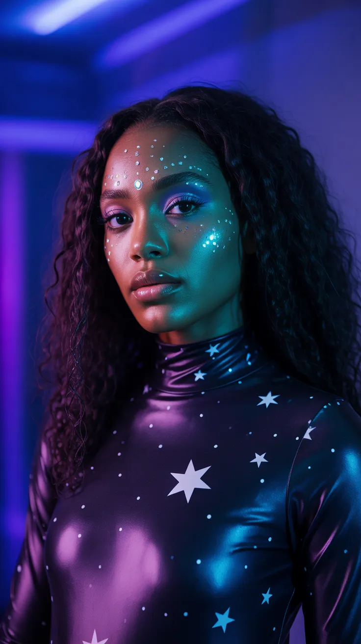 Channel your inner cosmic queen with this stunning galaxy girl look! The star print bodysuit paired with sparkling face gems creates a magical vibe that’s perfect for Halloween. Shine bright and show off your unique style this spooky season!