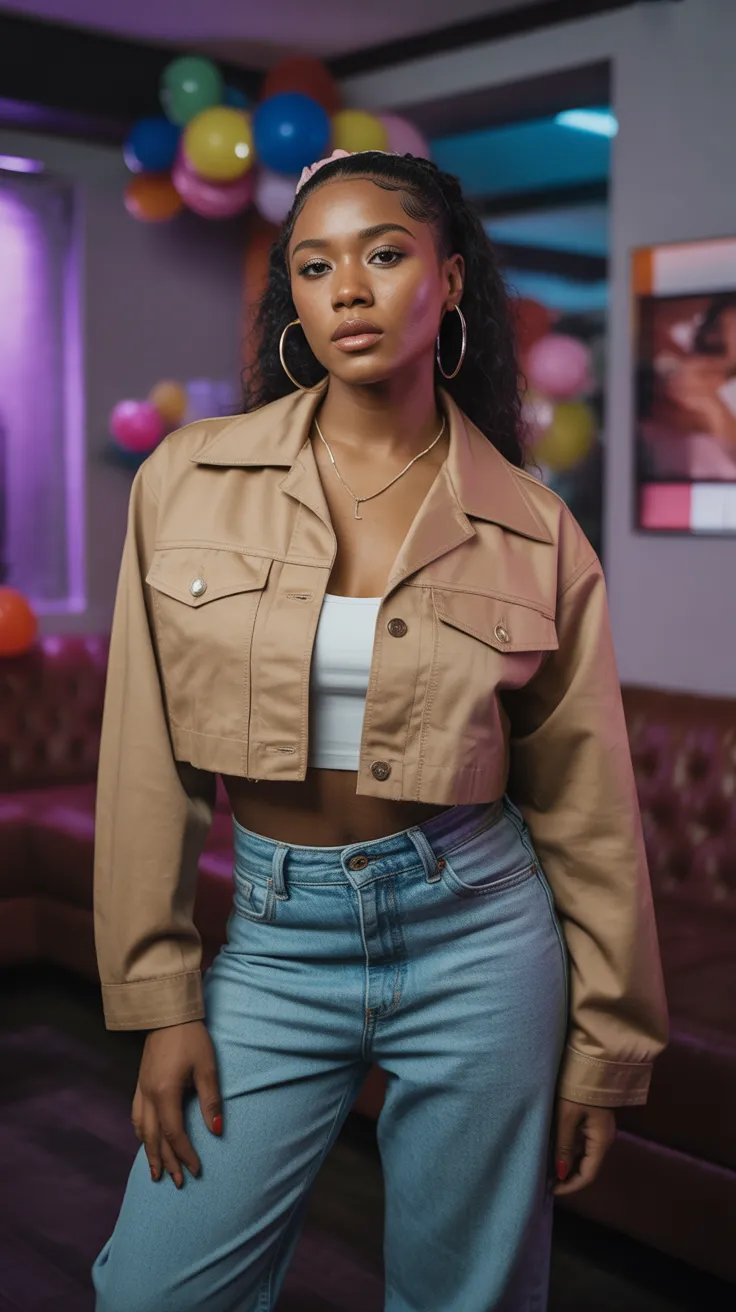 Channel your inner 90s R&B star with a bold crop jacket and oversized hoop earrings. This look is all about confidence and fun, perfect for Halloween. Pair it with some fierce makeup and you’re ready to shine!