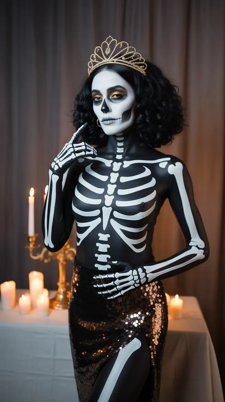 This Skeleton Queen look is a stunning blend of body paint and gold accents that truly stands out. The intricate designs and regal crown add a unique flair, making it perfect for Halloween. It’s a bold choice that celebrates beauty and creativity in a fun way!