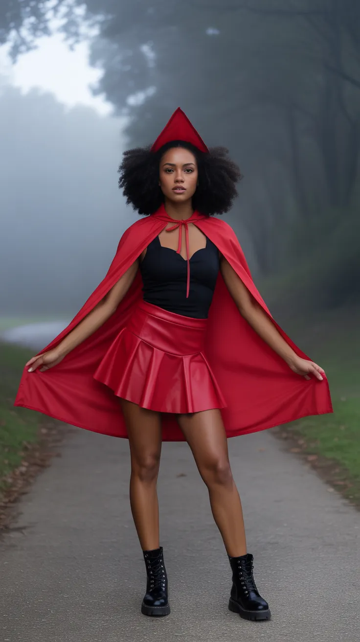 This Halloween, give a fresh twist to the classic Red Riding Hood look. Pairing a vibrant red cape with stylish combat boots and fabulous afro puffs creates a bold statement. It’s a fun way to celebrate the holiday while showcasing your unique style!