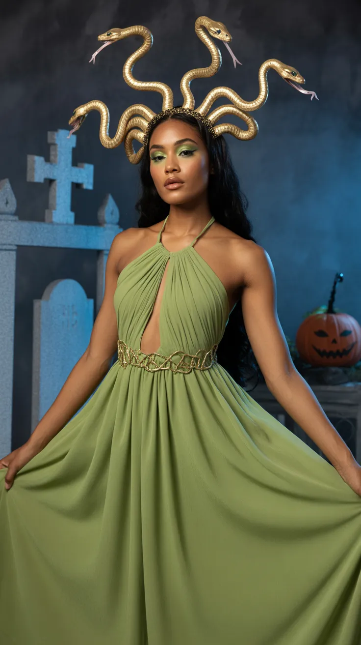 This Medusa-inspired costume is a stunning choice for Halloween. The green gown and snake crown create a bold and unique look that stands out. It’s perfect for those who want to express their beauty and confidence this spooky season.