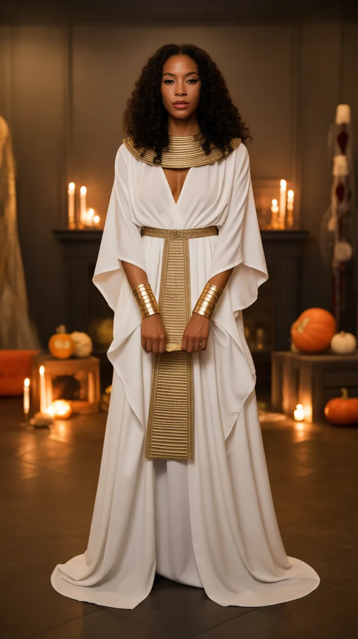 Channel your inner queen with this stunning Egyptian goddess costume. The flowing white robe paired with bold gold jewelry creates a look that’s both regal and captivating. It’s a perfect choice for anyone wanting to make a statement this Halloween!
