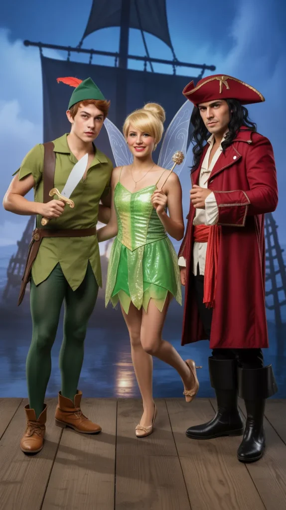 Straight from Neverland, this trio hits all the right notes. Peter Pan keeps it adventurous with green tights and a dagger, Tinkerbell sparkles with fairy wings, and Hook brings the drama with his red coat and feathered hat. What makes this one so fun is the storytelling factorβyouβre basically acting out a fairytale wherever you go. Itβs a trio halloween costumes pick that works for all vibes: magical, playful, and bold. Want a fun touch? Add fairy dust glitter or carry around a treasure chest prop to really sell the theme. β¨